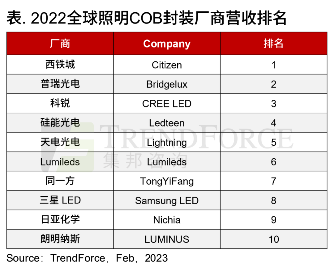 CREE是不斷耕耘照明市場(chǎng),主推主推大功率和COB產(chǎn)品,產(chǎn)品廣泛應(yīng)用于路燈、隧道燈及其他戶外大功率照明產(chǎn)品。2022年受商業(yè)照明市場(chǎng)需求下滑的影響,CREE COB封裝業(yè)務(wù)亦受到?jīng)_擊,不過依舊排名第三。