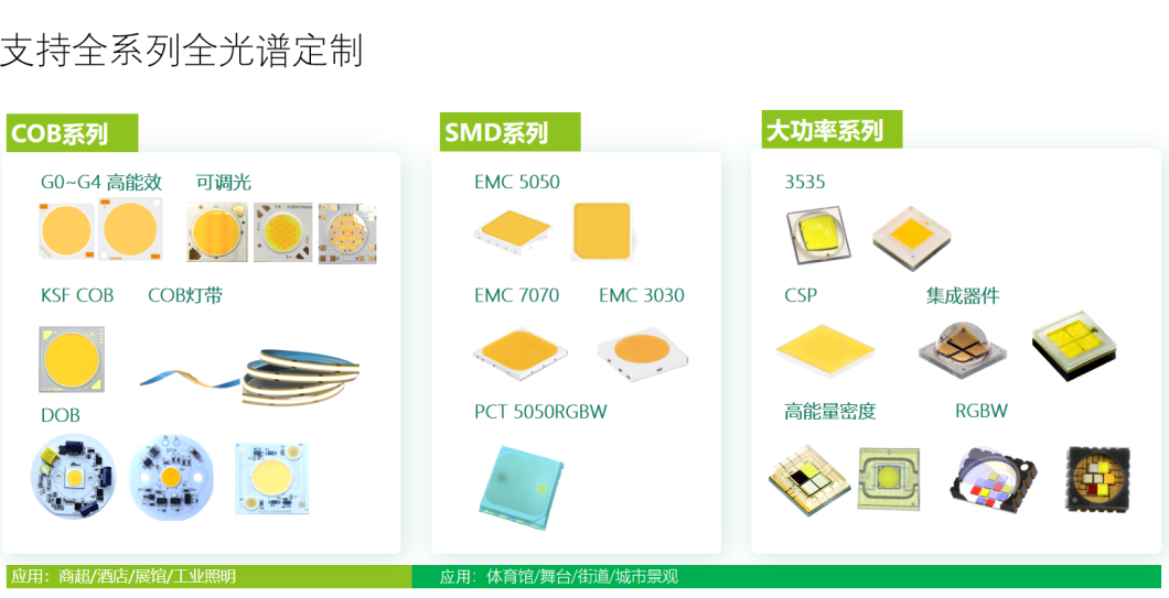 主要產(chǎn)品有:COB 全光譜產(chǎn)品系列、陶瓷大功率產(chǎn)品系列、SMD 產(chǎn)品系列,配備萬級無塵生產(chǎn)車間,擁有先進 LED芯片封裝產(chǎn)線和自動化、數(shù)字化管控體系,客戶主要為國際一線照明設(shè)施制造商或品牌營運商。
